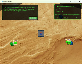NOTE: The game is limited to an 800x600 resolution, which you can play fullscreen (upscaled) or in windowed mode within the browser. Volatile Refinery does support scrollable planet surface maps and higher screen resolutions, but we intentionally limited the scope for the game jam.