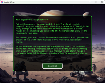 Welcome to Volatile Refinery! A space mining and resource management game that pits you against the competition in a race for a planet's valuable resources.